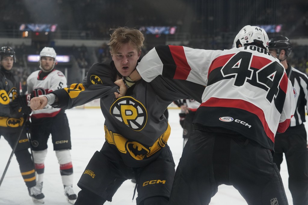 Providence’s Dalton Bancroft and Belleville’s Djibril Touré had a spirited bout on Friday night. (Photo courtesy of Providence Bruins)