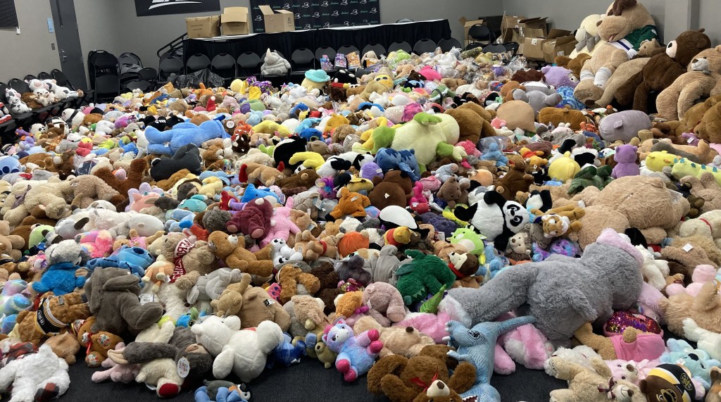 An impressive number of teddy bears and assorted stuffed animals were collected at Sunday’s Teddy Bear Toss.