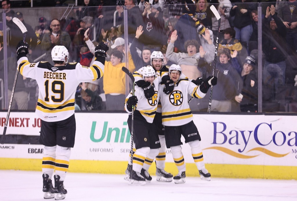 Celebrating Friday’s overtime win are, from left, Johnny Beecher, Jakub Lauko, Justin Brazeau and Connor Carrick. (Photo courtesy of Providence Bruins)