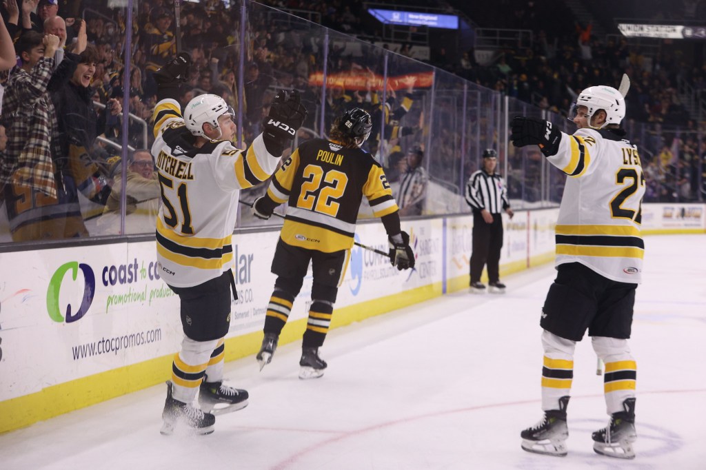 Ian Mitchell and Fabian Lysell celebrate Mitchell’s overtime goal in Friday night’s come-from-behind win over Wilkes-Barre/Scranton. (Photo courtesy of Providence Bruins)