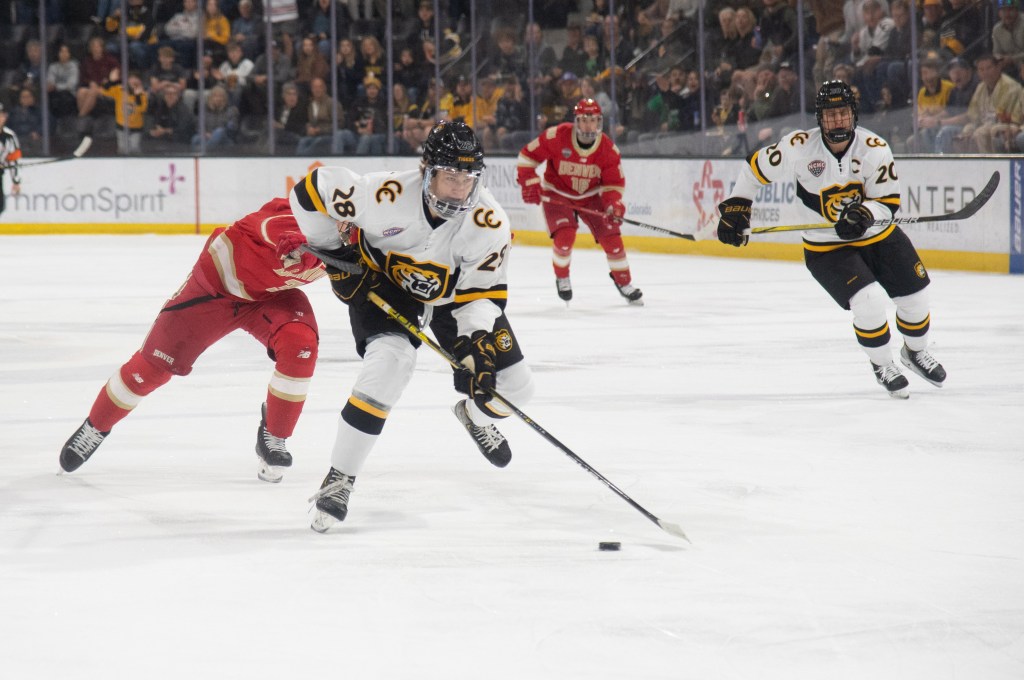 Colorado College’s Gleb Veremyev celebrates a goal against Minnesota Duluth. (Photo courtesy of Colorado College Athletics)
