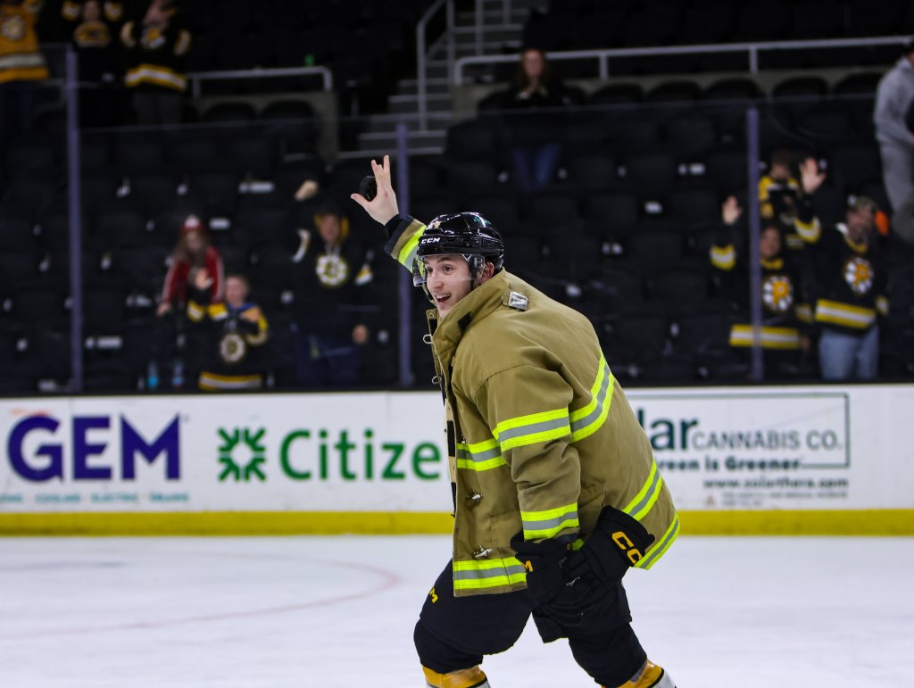 Ty Gallagher wore the fireman’s jacket after scoring a hat trick on First Responder’s Night on Saturday. (Photo courtesy of Providence Bruins)