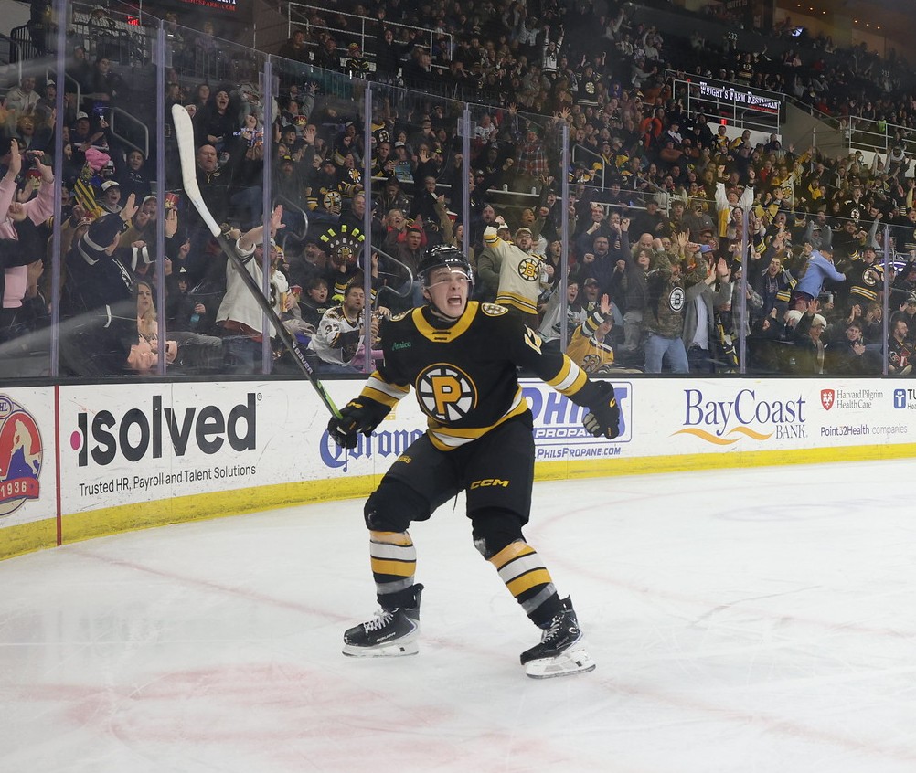 James Hagens cclebrates his first goal as a pro on Saturday. (Photo courtesy of Providence Bruins)