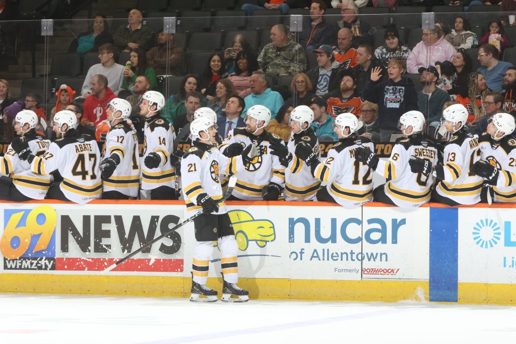 Jackson Edward (41) played 31 AHL games last season. (Photo courtesy of Providence Bruins)